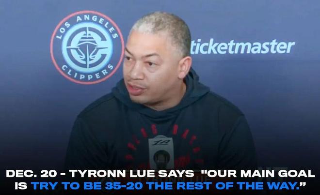 時(shí)間回到去年12月,快船對(duì)陣湖人的第二次交手之前,泰倫盧在接受采訪時(shí)表示,快船要在接下來(lái)的比賽里取得35勝20負(fù),從而將勝率提升到50%。